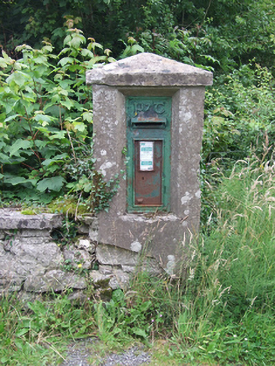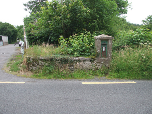 Prominently sited at a road junction this cast-iron post box is an important feature in the historic rural landscape. The wall box follows the basic type used under the postal system of the United Kingdom, reconfigured to include the raised initials "P&T" representing the Department of Posts amd Telegraphs (1924-1984) in Gaelic typescript. This emblem is of historical and artistic interest, demonstrating the symbolic importance of the Irish language in the emerging Irish state. The box is still in use and forms a key feature of a rural crossroads serving as a physical record of the social heritage of the area.