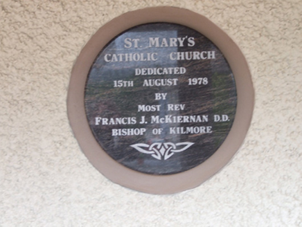 Freestanding fan-plan double-height Roman Catholic church, built 1978, with central projecting sanctuary in curved east elevation, clerestorey windows to front elevation over single-storey section rotated to face Chapel Square containing entrance lobby, sacristy to north-west and side chapel to south, belfry composed of four freestanding concrete columns in V-arrangement rising from sanctuary of side chapel, lower canopy on round columns across front elevation. Metal-sheeted roof to main church space of radiating timber-clad beams sloping upward from clerestory over entrance lobby to wider altar end with flush rooflights over sanctuary. Aluminium coping to parapets, flat roofs to canopy, entrance lobby, side chapel and sacristy. Roughcast rendered walls with smooth rendered plinth course. Round polished stone plaque within canopy inscribed ‘ST MARY’S / CATHOLIC CHURCH / DEDICATED / 15TH AUGUST 1978 / BY / MOST REV / FRANCIS J. McKIERNAN D.D / BISHOP OF KILMORE’. Aluminium windows to clerestory, side chapel, and sacristy. Double-height angle-headed aluminium windows flanking wide end of church space. Vertical slit windows forming projection in sanctuary. Three timber doors open to canopy above single step. Acoustic ceiling panels on lateral purlins over radiating timber clad beams supported on engaged columns at narrow and wide ends of main church space. Painted fairfaced blockwork walls, stained glass to clerestorey and sanctuary of side chapel. Timber seating arranged in wedge-shaped blocks radiating from rectangular altar extending forward from sanctuary recess below four-sided rooflight shaft angled to underside between central beams. Set back streetline with pedestrian access via steel gates.