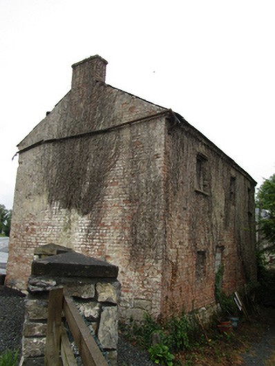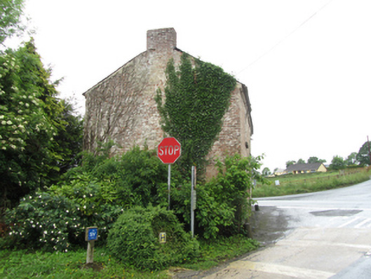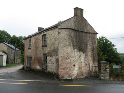 Detached two-bay two-storey house, built c.1860, with former shopfront at ground level, and three bays to rear. Now disused. Pitched slate roof, clay ridge tiles, brick chimneystacks to gables, cast-iron rainwater goods, corbel course to eaves. Formerly rendered brick walls in English garden wall bond on rubble stone base visible to rear, vestiges of lime render remaining. Two-over-two timber sash windows with brick flat-arch heads and stone sills. Semi-elliptical arch to eastern bay, reduced in size historically to form square-headed opwning with display window to side of four-panelled door. Timber sheeted rear door. Opens directly to road and set diagonally at crossroads.