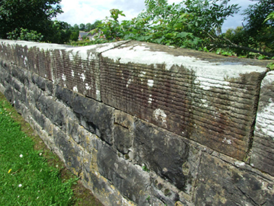 Single-arch road bridge over former railway line, built c.1860. Abutments of squared and snecked rock-faced sandstone having smooth plat band with bevelled upper face at springing point returning on bridge faces as impost block. Soffit of squared stonework. Elliptical arch with rock-faced voussoir stones. Spandrel walls, parapets, and flanking buttresses flush at road face, all of squared snecked rock-faced stonework. Smooth string course below parapet. Coping of square cut stone with shallow pyramidal capstones to piers, copings tooled with horizontal corduroy pattern. Random rubble stone wing walls with Scotch coping. Ramped and curved approach roads to humped deck.