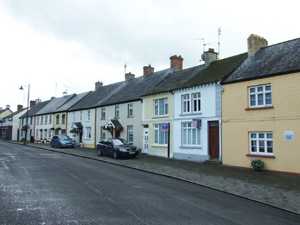 Terraced two-bay two-storey house, built c.1890. Pitched slate roof, clay ridge tiles, rendered chimneystacks shared with neighbour, exposed timber rafters at eaves, cast-iron rainwater goods. Smooth rendered walls to ground floor with plinth expressed at door opening, string course separating ground and first floors, roughcast rendered walls to first floor with smooth rendered quoins to north boundary. Paired timber casement windows to first floor, fixed top lights with cruciform subdivision over single-pane side-hung casements and concrete sills. Single quadripartite window aligned beneath at ground floor with matching fenestration pattern. Replacement timber panelled door with fixed overlight. Stone step and threshold.