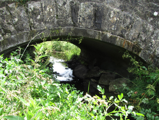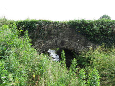 Single-arched stone road-bridge, built c.1780, spanning waterway with low banks. Recent concrete supporting barrel to underside of original arch. Segmental arch with roughly-cut stone voussoirs. Rubble-stone spandrels and parapets with Scotch coping.