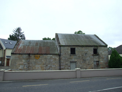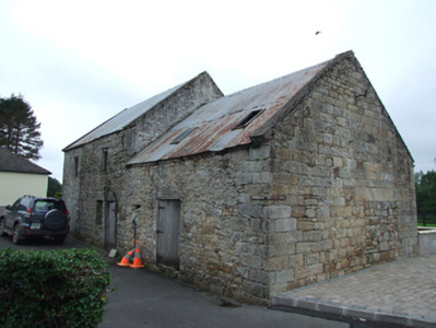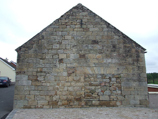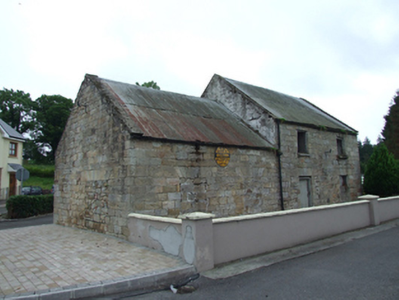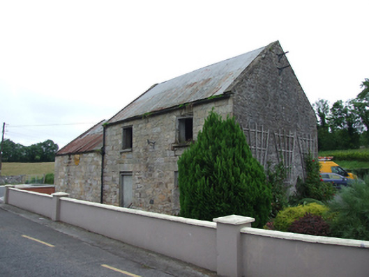 Detached two-storey two-bay former house, built c.1800, with attached single-storey two-bay outbuilding of same date. Now disused. Pitched replacement corrugated-iron roof, cement barges to gables, cast-iron rainwater goods to front elevation. Squared and coursed rubble red and yellow sandstone walls. Square-headed window and door openings to front rear and end having flat-arched stone heads with cut voussoirs and stone sills. Timber sheeted door with former side lights blocked up with roughly dressed stone. Two former doors to front of outbuilding and wide window opening to west gable also blocked up with stone. Three timber sheeted doors to rear. Set back from road with recent boundary wall to front.
