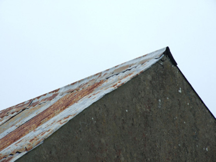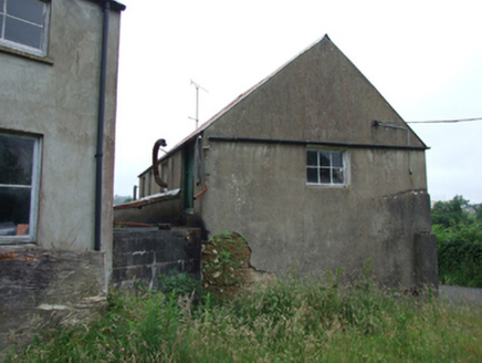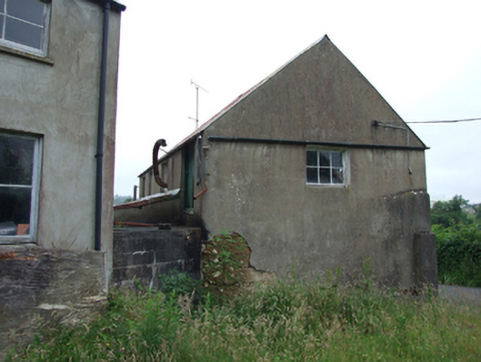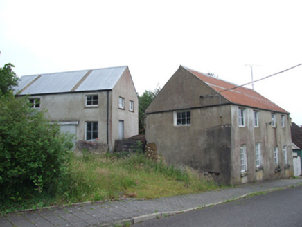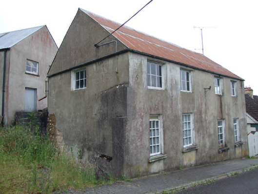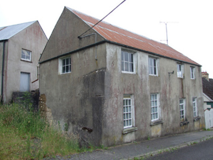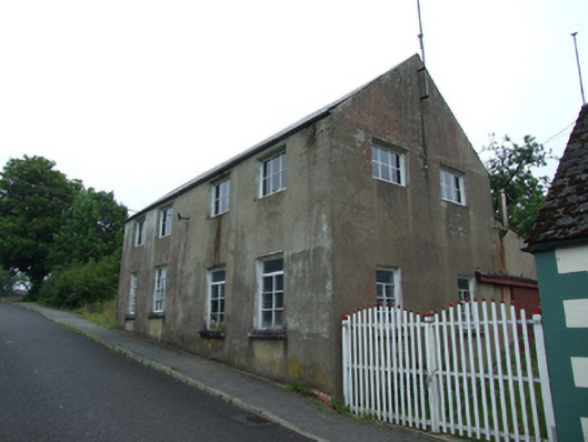 Detached four-bay two-storey building, built c.1880, with entrance to rear, set on slope with split-level ground floor, and lean-to to rear with separate two-storey structure set perpendicular to south. Pitched roof corrugated-iron roof with roll-profile ridge and cast-iron rainwater goods. Rendered mud walls. Six-pane bottom-hung casement windows to upper floor with two bays to west gable and single-bay to east gable, all witout sills . Ground level windows to front having two twelve-pane timber windows to east bays, two six-pane windows with overlights set lower to west bays, two smaller windows of same divisions to west gable, all with pre-cast concrete sills. Fronting directly on to street.