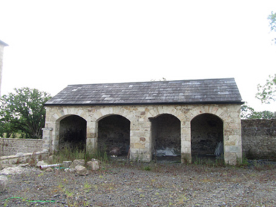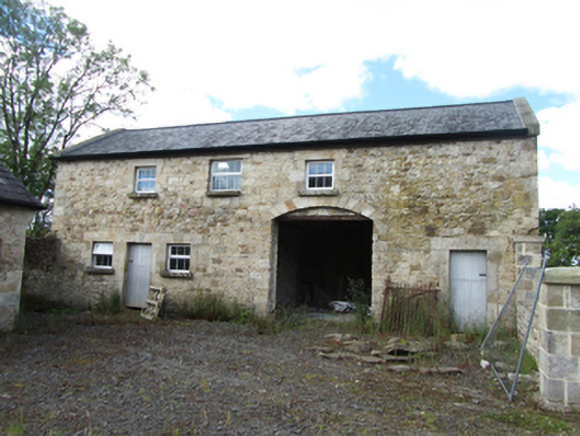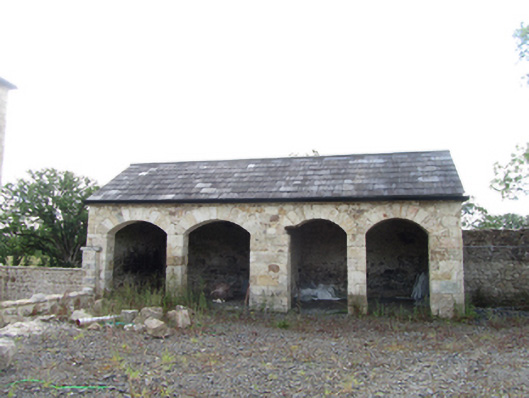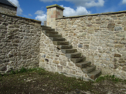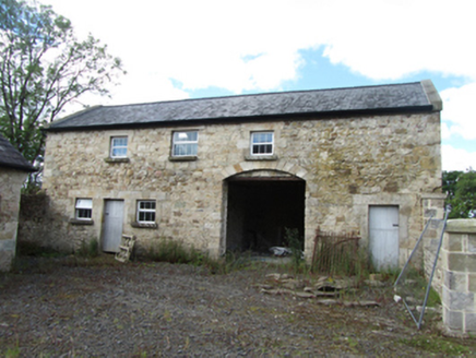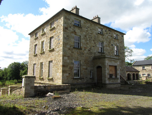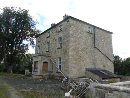 Detached square-plan three-bay three-storey over basement former glebe house, built c.1820, with single-storey entrance porch, and three-bay rear and east side elevation employing blind windows for symmetry, sloping site exposing basement on rear and sides. Currently undergoing renovation. Hipped slate roof around central valley, rendered chimneystacks flanking central bay, pressed metal rainwater goods. Historic render removed to expose squared rubble-stone walls laid to courses with dressed corner stones, bevelled plinth course above basement. Window openings with dressed stone lintels and keystones, voussoirs to blind windows, block-and-start jambs, and stone sills. Graduated window heights with replacement six-over-six and three-over-three timber sash windows, tripartite Wyatt formats to outer bays of rear garden elevation at all levels. Central entrance porch, recently raised, with profiled cornice, segmental arches to door and side window opening. Basement well between house and outbuildings to west side with single-storey lean-to entrance porch at basement and stone access steps to front area. Detached single-storey sandstone coach house to south side of yard with pitched slate roof and arcade of four segmental arches with voussoirs. Detached four-bay two-storey outbuilding to west side of yard having pitched slate roof with stone barges, stone lintels with keystones to openings, voussoirs to segmental arch opening, timber sheeted doors, and uPVC windows. Wall to yard with ashlar piers, recently reduced in height. Recent setback stone entrance with metal gates to road.
