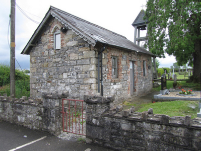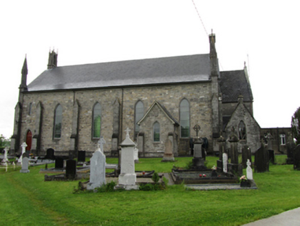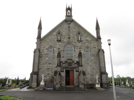 Freestanding Gothic Revival Roman Catholic church, built c.1850, with crenellated entrance porch, five-bay nave with gabled side chapel and lobby on either side, chancel added c.1870 with gabled sacristy to side having flat-roofed twentieth-century extension. Pitched slate roofs altered to have oversailing concrete eaves and verge, pressed metal rainwater goods. Ashlar bellcote to chancel gable. Coursed squared rubble sandstone walls, render to nave gable adjoining chancel. Ashlar piers to nave corners surmounted by octagonal-profile pinnacles, rising from gabled and stepped angle buttresses. Gabled and stepped buttresses with weatherings between nave bays. Decorative gabled canopy with corner pinnacles hsving statue of the Blessed Virgin Mary, panelled plinth on console surmounting main gable. Pair of pointed statue niches with hood mouldings on projecting consoles flanking engaged cross finial over ogee hood moulding to central pointed arch window, with flanking lancet windows. Projecting porch with stepped crenellated parapet having corner piers and buttresses reflecting nave corners, but surmounted by domed pinnacles with Greek cross finials. Square-headed doors with stepped hood moulding and timber doors with full height panels. Nave interior with flat plaster ceiling on triangular timber brackets with trefoil detail resting on wall consoles, centre of ceiling compartmented with acoustic panels, compartmented vaulted ceiling to chancel. Decorative plaster chancel arch springing from colonettes on decorative consoles. Blind clerestory arcade of decorative plaster to chancel walls, plaster colonettes and hoods to chancel windows. Richly carved timber gallery screen with open interlacing arch motif supported on arcade of pointed arches with fluted columns and carved spandrels, central bay raised and flanked by elaborately carved statues niches. Plain recessed confessionals, c.1940, beneath having octagonal vision panels. Leaded windows to nave and entrance gable. Stained glass to chancel windows. Timber doors with leaded light above. White marble central and side altars with coloured marble columns and inlays. Recent marble tabernacle, octagonal stone font, recent timber pews. Opens to stone entrance steps at main and side entrances. Graveyard to site. Detached three-bay single-storey outbuilding to site with pitched slate roof, two-over-two timber sash windows, and replacement timber panelled door. Recent steel framed bell-tower, c.1990, with slated pyramid roof. Double leaf decorative cast-iron gates flanked by square-profile ashlar limesonte piers with pyramidal copings capped by crucifixes, having flanking decorative cast-iron pedestrian gates, set in wing railings with stone plinth walls.