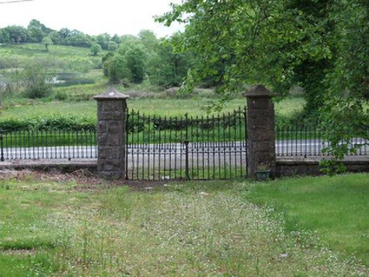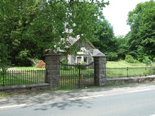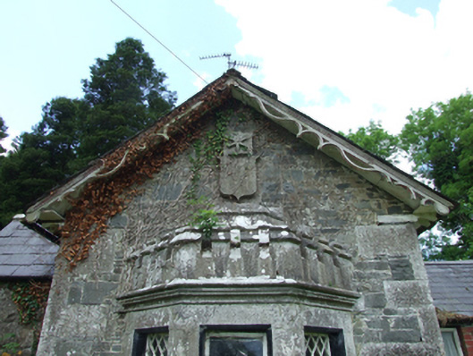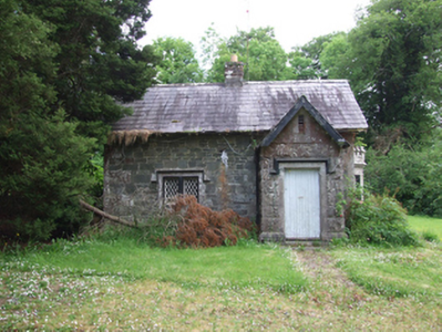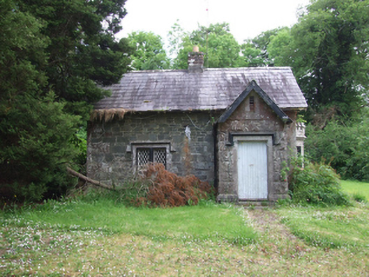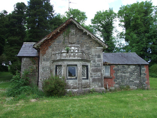 Detached Tudor Gothic two-bay single-storey gate lodge, built 1837, having gabled projecting porch to entrance front, single-storey return with extension to rear. Pitched slate roof with sandstone clay tiles, centrally positioned stone and brick chimneystack, cast-iron rainwater goods to original structure and part of extension. Oversailing eaves with timber soffit on paired timber brackets having timber wave and foil open decorative bargeboard to road-facing gable, recent timber barges to porch. Squared coursed rubble stone walls, with dresses limestone quoins, rock-faced ashlar to porch with bevelled sandstone plinth. Rubble stone walls with brick quoins to return. Crenellated canted bay window to east elevation with stone weathering to roof under blank shield surmounted by spur crest of Saunderson family. Metal lattice windows with chamfered sandstone surrounds and mullions, carved sandstone Tudor hoods. Recent timber casement windows to extension. Replacement timber boarded door to entrance, with stone-framed vent opening above door. Adjacent gateway at road having decorative cast-iron gates in square-profile rock-faced piers with concave pyramidal caps, finials missing, flanking wing railings set on stone plinth walls with bevelled stone copings.
