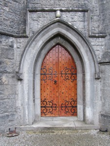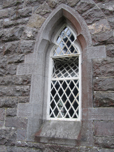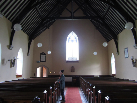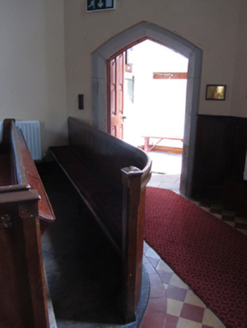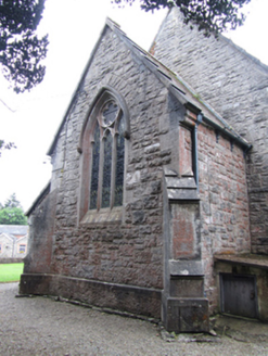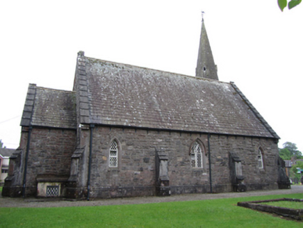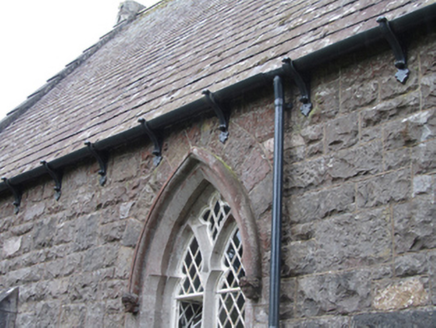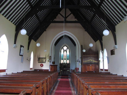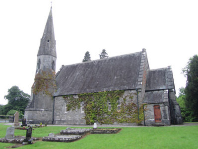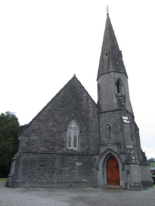 Freestanding Gothic Revival Church of Ireland church, built 1856, with three-bay nave and diagonally positioned three-stage entrance tower and spire to south-west corner, chancel to east, and vestry to south-east. Steeply pitched slate roof to nave and chancel, clay ridge tiles, stone weatherings to barges, cast-iron gutters on decorative cast-iron brackets. Octagonal-profile ashlar spire with lucarnes and weathervane above octagonal ashlar belfry stage. Pointed openings to belfry with hood mouldings over triangular stone weatherings forming transition to square-plan lower stages of tower over tiered diagonal corner buttresses. Squared rock-faced limestone walls to lower stages of tower and nave. Wall buttresses to north side of nave, tiered diagonal buttresses to corners of chancel and north corner of nave. Cusped lancet windows to nave with ashlar surrounds and metal lattice windows with ventilation lights, twin-light stone tracery windows to west gable and to centre bay of north having hood moulding on carved head labels, triple-light tracery with quinfoil roundel and stained glass windows to chancel window. Pointed arch double-leaf studded timber main entrance door with ornate strap hinges, set in recessed and bevelled surround with hood moulding. Square-headed vestry door with corbelled lintel and studded timber door with ornate strap hinges. Exposed timber rafters and paired trusses standing on corbels to interior. Timber sills and timber dado to ends of nave. Decorative tiled floor to aisle, entrance area, and area in front of altar, raised timber floor under pews, steps to altar area. Timber pulpit, altar, and pews with curved end to pew at entrance. Graveyard to site, surrounded by recent stone boundary walls with metal entrance gates.