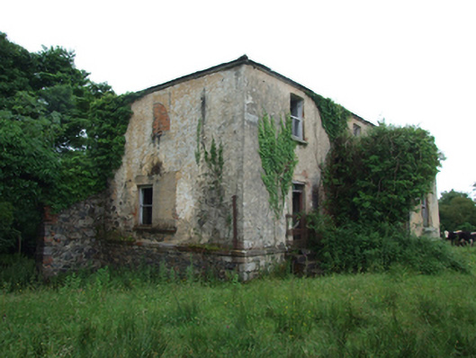 Detached three-bay two-storey over basement country house, built c.1770, with porch added to front elevation, c.1820. Possibly later in use as Orange Hall, now disused. Hipped slate roof, clay ridge tiles, corbel course to eaves, flat roof to porch. Rendered rubble stone walls, stone string course above plinth, brick dressing to openings. Convex stone cornice profile to porch. Remains of two-over-two timber sash windows with stone sills. Stone architraves to outer and inner porch door openings. Ground falls away to the east to reveal the basement in full elevation. Brick and stone arch in abutting wall to the north of house with remains of cast-iron gates. Outbuildings no longer extant.
