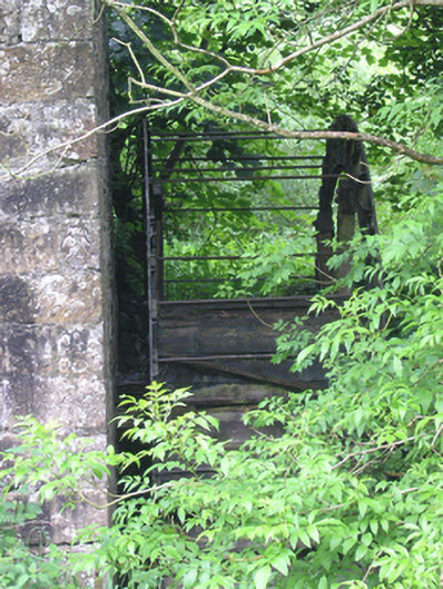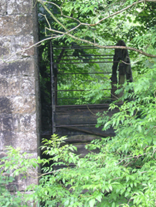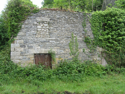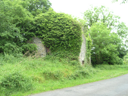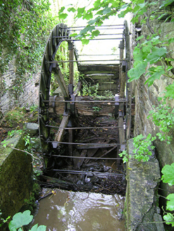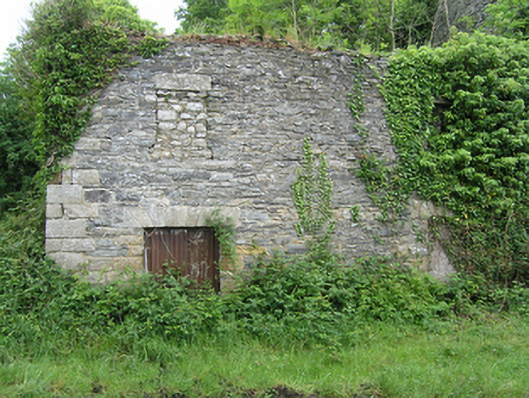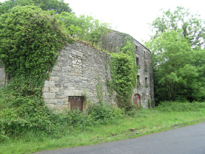 Detached two-bay four-storey water mill, built c.1800, with two-bay two-storey wing having steps at gable end to first floor entrance, external water wheel to east. Now disused. Pitched slate roof to mill, wing roof collapsed. Roughly coursed rubble limestone walling with dressed cornerstones, stone lintels to upper level windows with stone sills. Elliptical and flat headed door openings with dressed voussoirs, one opening blocked up with post box of c.1905 inserted. Wheel comprising cast-iron shroud plates and wooden axle fed at low-breast level, timber sole plates and buckets now disintegrated, mill race passes under the road spanned by a masonry arch. Set back at a slight angle from road.