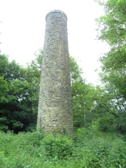 Freestanding circular-plan chimney, built c.1860, now disused. Roughly coursed rubble limestone shaft terminating in annulus of brickwork with serrated face over projecting brick-on-edge course. Associated with a former corn mill and flax mill complex.