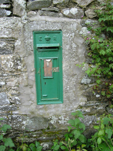 Cast-iron post box, c.1905, with ER VII insignia and crown motif, set in concrete surround into a blocked up door in the front elevation of the Coppanagh Corn Mill.