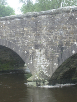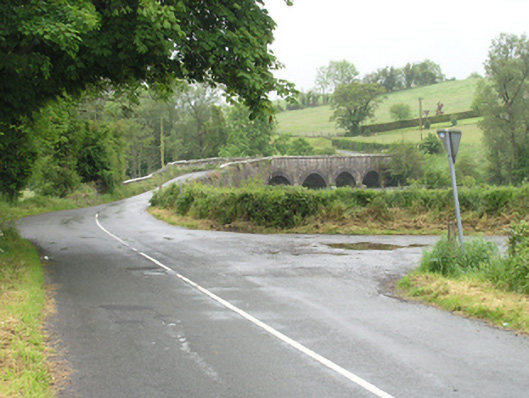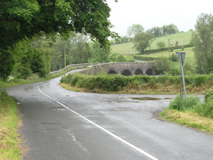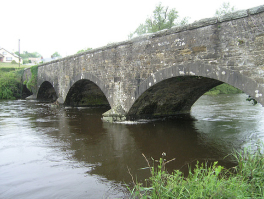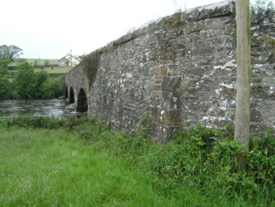 Four-arch limestone road bridge over Annalee River, built c.1830. Segmental arches with punch-dressed ashlar voussoirs. Ashlar V-cutwaters with half-pyramidal caps. Spandrels and parapet of roughly coursed squared limestone. Rock-faced coping of large limestone blocks with dressed edging on oversailing river faces. Battered base to ramped approach. Separate single-arch bridge over mill race close to former Ballynallon Mills, to north.
