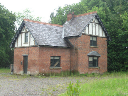 Detached T-plan Arts and Crafts style single- and two-storey house, built c.1890, having advanced entrance bay to north with gable attic, two-storey section to east, small parallel gabled annexe to east gable, recent lean-to extension to north. Pitched slated main roof with crested clay ridge tiles at three levels, overhanging eaves and verges with bracketed eaves and crested timber bargeboards to four gables. Altered brick chimney stack to higher ridge. Half-timbered effect to gables with trowelled stucco infill. Brick walls in English bond up to eaves level. Square-headed window openings with replacement diamond-paned windows and stone sills. Square-headed door to advanced gable with cut-stone plinth blocks.