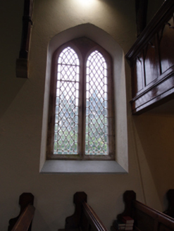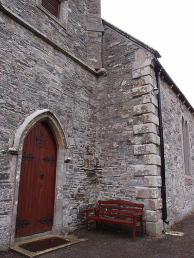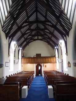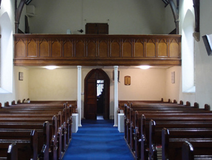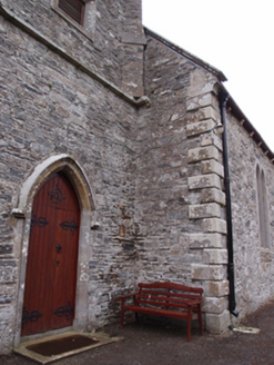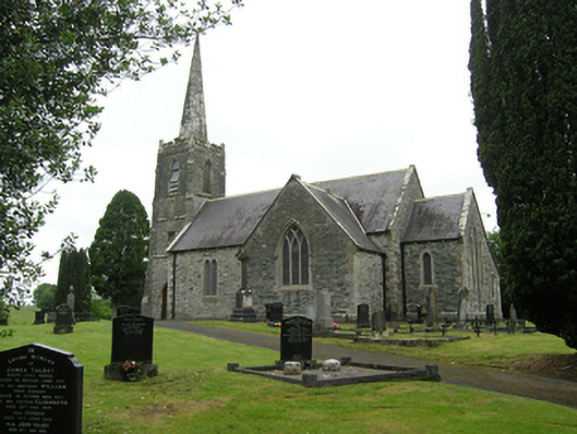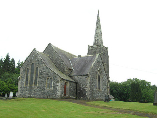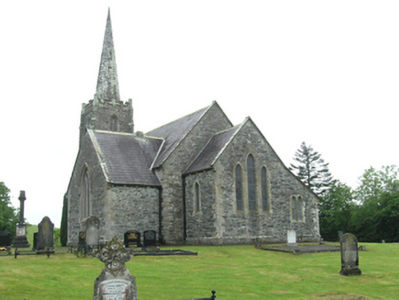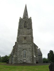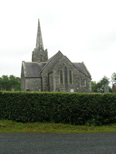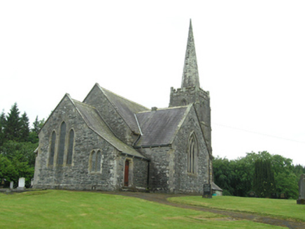 Freestanding cruciform-plan Church of Ireland church, built 1796, with centrally placed four-stage entrance tower to west gable having octagonal-profile ashlar spire addition, c.1820, transepts and chancel additions and interior refurbishments dating to 1860-61, and vestry attached to north side of chancel. Pitched slate roof with clay ridge tiles, barge stones to gable with ogee kneelers at eaves, cast-iron rainwater goods carried on corbels. Cut-stone chimneystacks to transepts. Crenellated ashlar parapet with plain corner turrets to tower. Roughly coursed rubble sandstone walls having raised ashlar quoins to nave, flush quoins to later transepts and chancel, and plinths to transepts and chancel. Tower turrets set above stepped diagonal corner buttresses with weatherings at four stages. Random rubble stone walls to tower, having moulded string courses marking stages. Paired lancets to nave, triple-light windows to transept with switch-line tracery, hood mouldings, and label stops. Pointed louvred belfry openings to fourth stage of tower, short blind lancets to third stage, square-headed openings to second stage with louvre infill and splayed sides. Double light lancet to west of first stage with hood moulding and label stops. Graduated triple lancet to chancel. Paired lancets with splayed jambs and cusps to vestry. Entrance in south elevation of tower with pointed arch opening having timber sheeted double doors. Interior with timber open arch-braced collar roof with wall posts rising from corbels between bays. Transepts decorated with reduced inner order rising from plain triangular corbels with a lower plainly treated chancel arch. Gallery at west end retains early plainly treated front with trefoil headed arched panels supported on cast-iron clustered colonettes. Straight-backed bench seats, pulpit, reader’s desk, and communion rails all date to 1860-1 refurbishment. Stained glass dates to 1890-1905 period, while nave windows retain diamond patterned paned clear glass. Decorative clay floor tiles in chancel with timber step to front, and raised timber floor below pews. Surrounded by graveyard and bounded by rubble stone piers with pyramidal cappings flanking wrought-iron double gates to south-east and recent metal pedestrian gate to north-east.
