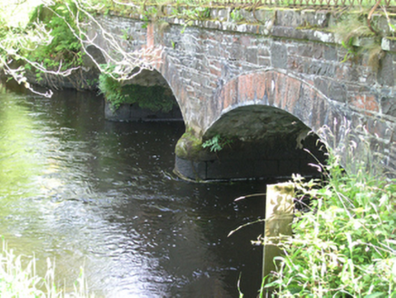 Triple-arch limestone and sandstone road bridge, built 1858, over Dromore River. Cut-stone copings serving as plinth for cast-iron diamond lattice railings to both sides of flat tarmacadam deck. Railings terminating with square-profile lattice piers with domed finials. Roughly coursed limestone spandrels capped by projecting cut-stone course below parapet copings. Cut voussoirs to segmental arches with sharp arris to arch rings. Date stone on upriver elevation to top of arch with Clements family arms shield to arch on downriver elevation. Roughly coursed stone soffits. Rounded dressed limestone U-cutwaters with rounded cappings. Ashlar abutments. Imposts of outer arches rounded towards bank.
