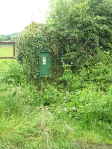 Wall-mounted cast-iron box, erected c.1940, with raised ‘P & T’ lettering in Celtic Revival script above hooded letter opening. Set in a field entrance gate pier.