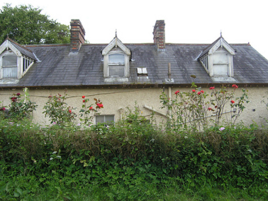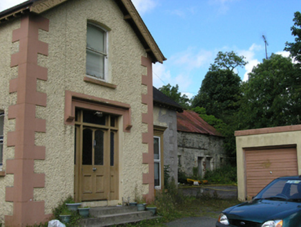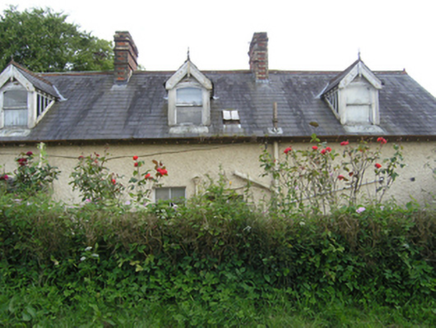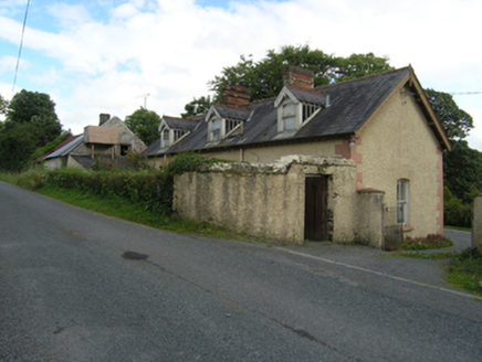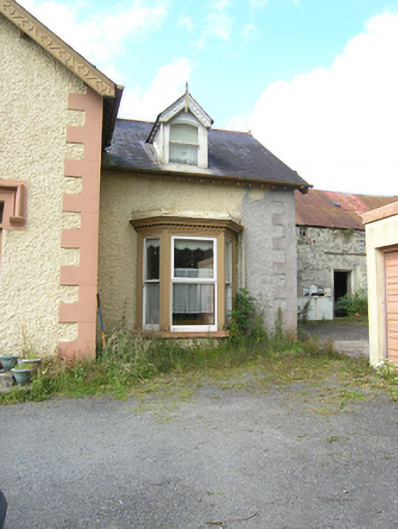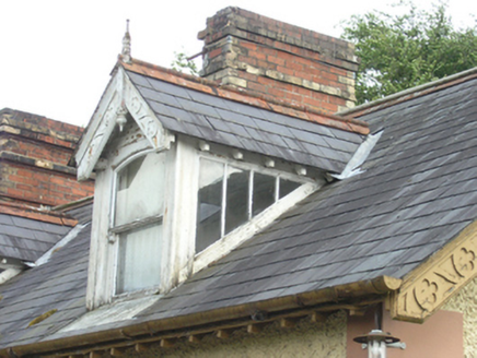Detached three-bay single-storey with dormer attic house, built c.1880, with advanced gabled two-storey central entrance bay flanked by canted bay windows, extended 1912. Now vacant. Pitched slate roof with roll-top terracotta ridge tiles, decorative bargeboards supported on purlins on gable ends with trefoil motif and drop finial, overhanging eaves with exposed rafters, and cast-iron rainwater goods. Pair of red brick chimneystacks having yellow-brick quoins, string course, and brick cornice, flanking centre bay indicating tripartite internal division. Two dormer windows to front and three to rear having slate roofs with roll-top terracotta ridge tiles, decorative bargeboards with drop finials and crowning finials, glazed cheeks, and one-over-one timber sash windows with segmental heads. Wet-dash rendered walls with raised stucco quoins, stucco surrounds to bay windows with dentilled cornice, and stone sills. West bay windows with two-over-two timber sash windows to centre and one-over-one sash windows to sides. East bay window with uPVC replacement windows. One-over-one timber sash window above entrance, one-over-one timber sash window to side of porch with margin panes, two-over-two timber sashes to rear and west gable. Wide square-headed entrance door opening with heavy stucco hood moulding having plain stops. Timber door and side lights with glazed upper section and bolection mouldings to lower panels, with plain overlight and stone steps. Rubble stone outbuildings to east with pitched corrugated-iron roofs. Roughcast rendered boundary walls with concrete copings, square-profile piers and cast-iron gates. Roughcast rendered pointed arch to garden.