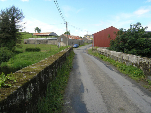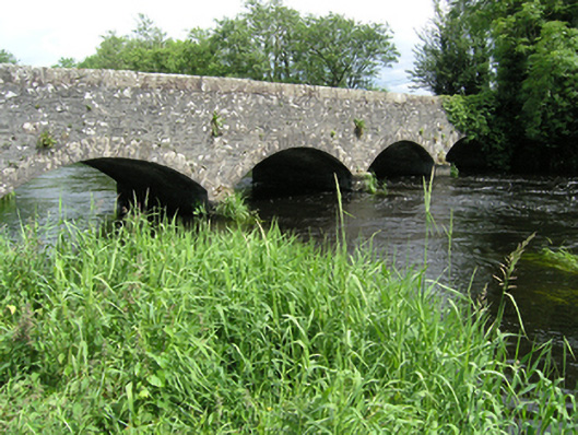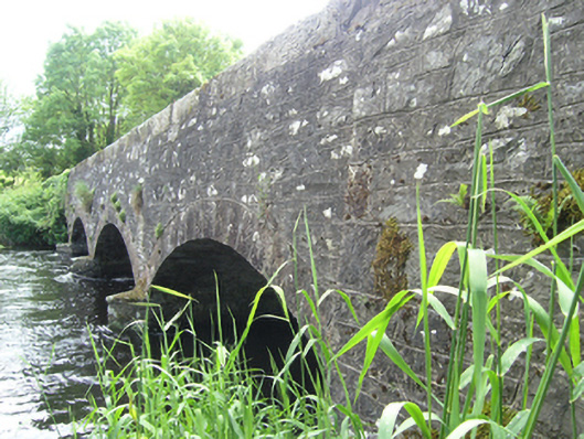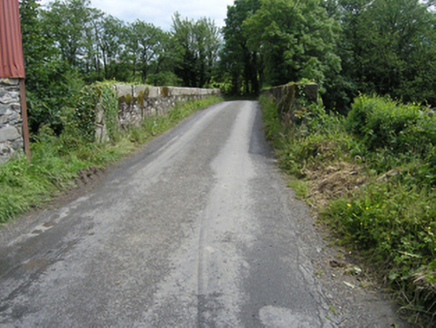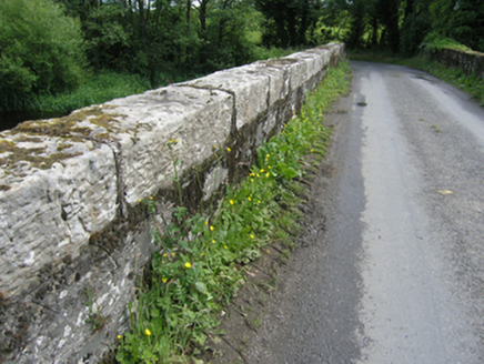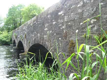Four-arched masonry road bridge, built c.1860, across Dromore River. Narrow tarmacadam deck with large hammer-dressed blocks to parapet coping. Parapet and spandrels of random rubble-stone. Shallow segmental arches with cut-stone voussoirs. Ashlar abutments with V-cutwaters. Battered approach ramps.