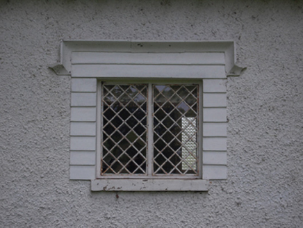 Detached three-bay single-storey gate lodge, built c.1845, with lean-to return. Now disused. Hipped slate roof with paired eaves brackets, off-centre rendered chimney stack, replacement rainwater goods. Roughcast rendered walls with smooth-rendered plinth. Windows openings with smooth render channel-jointed surrounds below hood mouldings and cut stone sills. Lattice paned cast-iron windows in timber frames to front elevation, replacement uPVC elsewhere. Central doorway with channel-jointed surround and sheeted double leaf doors. Set back from road with replacement gate, demesne entrance leading north-west from lodge.