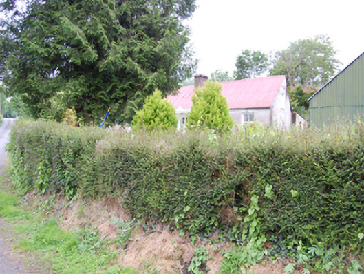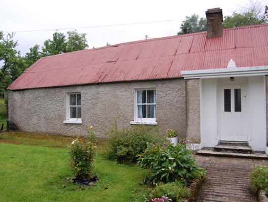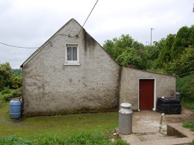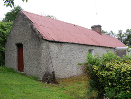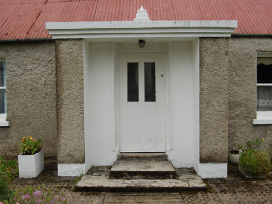 Detached five-bay single-storey lobby-entry vernacular house, built c.1850, single-bay off-centre entrance porch to front and single-storey lean-to extension to rear. Steeply-pitched corrugated-metal roof, rendered chimneystack, replacement rainwater goods, flat roof to porch with stepped cornice and central finial. Roughcast rendered walls, smooth render to plinth and within porch. Window openings irregularly spaced, having smooth-rendered reveals, cut-stone sills and two-over-two timber sash windows to front elevation, fixed timber window to north gable. Door recessed within porch with half-glazed and sheeted timber door. Replacement sheeted timber door to south gable. Set back from road with front garden having corrugated metal outbuilding to east and pedestrian entrance with square-profile rendered piers and replacement gate to road.