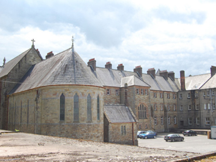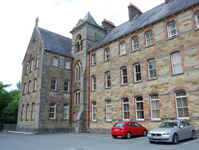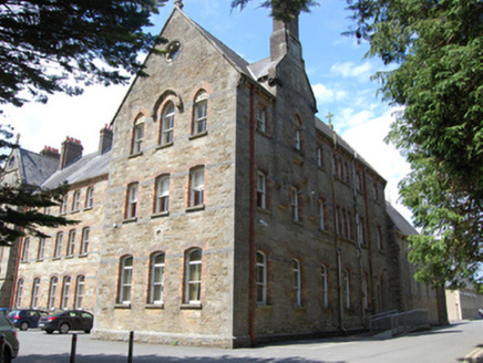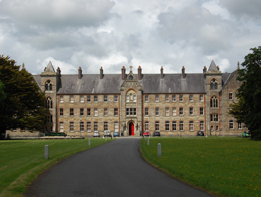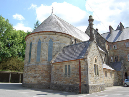 Detached Gothic Revival H-plan twenty-three-bay three-storey over basement former seminary college, built c.1870, having central gabled breakfront, square-plan four-storey towers at intersection of gable-fronted three-storey advanced end bays of flanking wings. Eight-bay east wing and ten-bay west wing enclosing rear courtyard with symmetrically placed corbelled gablets surmounted by chimneystack. Symmetrical rear elevation with central projecting bay. Four-bay church with full-height bowed apse attached to end of east block having five-bay lean-to aisle with gabled sacristy set at right angle on courtyard side. Seventeen-bay three-storey extension of c.1940 to rear of west block. Steeply pitched slate roof with eaves supported by moulded stone corbels, tall red brick chimneystacks with string courses and cornice details regularly spaced along ridge, circular- and square-profile cast-iron rainwater goods. Pyramidal slate roofs to towers with cornices and stepped parapets. Gables of central and terminating bay with cut stone fractables and surmounted by finials. Squared sandstone walls with chamfered limestone plinth and limestone courses above sills and beneath arches. Central gabled breakfront with clock to gable apex over stepped moulded course over triple slit openings and heraldic angel to kneelers. Two-storey red-brick arched recess having tripartite arrangement of pointed arch windows at second floor flanking statue niche, shielded quatrefoils to spandrel panels over triple square-headed first floor windows. Moulded cut sandstone surround to pointed arch main entrance door flanked by half side-lights, having pointed arch timber door with raised panels. Segmental-headed window openings to ground and first floor, shoulder-arched openings to second floor of main block. Pointed arch windows to second storey of terminating gables with hood mouldings to central windows and multifoils to apexes. Two-over-two timber sash windows with fixed overlights to segmental-headed windows. Dressed red-brick surrounds to segmental-headed second-storey opening and pointed arch third and fourth storey opening of towers, openings with sandstone tracery comprising of triple pointed arches with quatrefoil motifs to third storey and double round-headed arches with cinquefoil motif to fourth storey. Church with chamfered sandstone window surrounds with alternating cut limestone and sandstone voussoirs, pointed arch window opening to east elevation, trefoil-headed openings to apse and paired shoulder-arched openings to side aisle with multifoil openings to nave, multiple pane stained-glass to windows. Square-headed windows to extension with triple window arrangement to stair wells and flat canopies to entrances.
