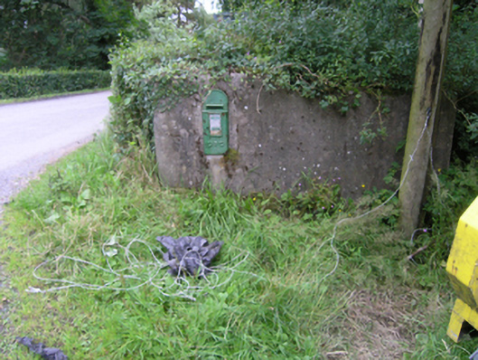 This cast-iron post box, which is still in use, represents a good example of the high quality of mass produced cast-iron work in the past. The Gaelic script records the promotion of Irish national identity following the establishment of the Free State. This particular design probably dates to after c.1937, as earlier post-Independence post boxes usually had the ‘S.E.’ cipher of Saorstat Eireann. Located beside a former shop and near disused mills, this crossroad once played a significant social role in the rural community.