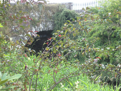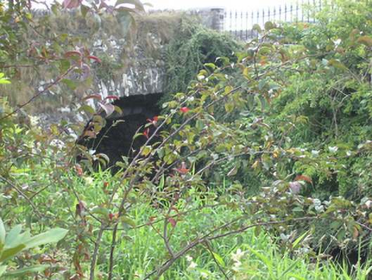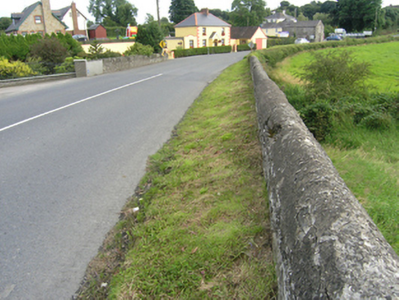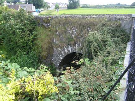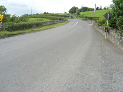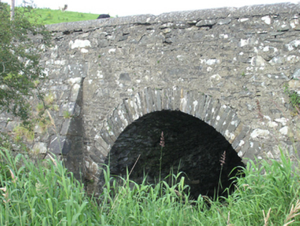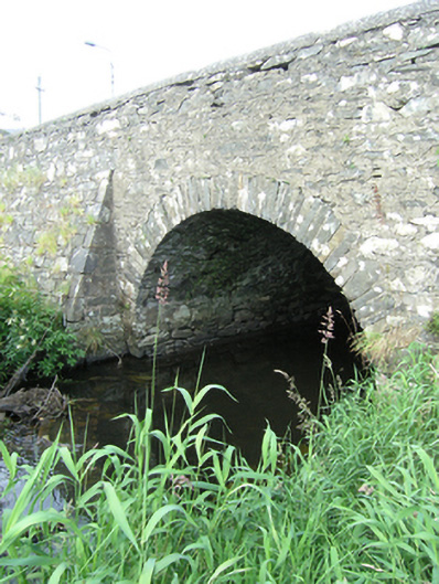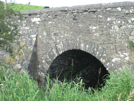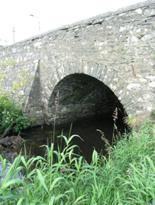 Single-arch masonry road bridge, built c.1750, over water course. Roughly coursed rubble stone elevations and parapets with rounded render copings, parapet to upriver elevation with Scotch coping. Segmental arch having narrow roughly dressed voussoirs. Buttress to north west wing of limestone masonry blocks. Upriver elevation modified on the west side to accommodate road bend.