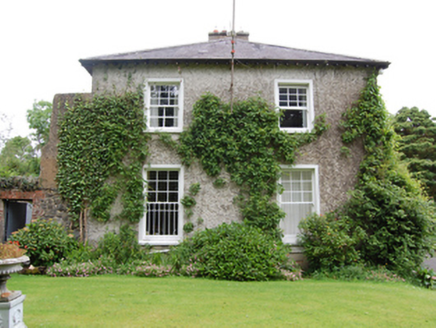 Detached three-bay two-storey former rectory, built c.1880, with two-bay side elevations. Now in use as private dwelling. Hipped slate roof with paired rendered chimneystacks, overhanging eaves supported by carved timber eaves brackets. Roughcast rendered walls with smooth rendered plinth. Square-headed window openings with smooth render surrounds and chamfered sills, having six-over-one timber sash windows with concave horns. Segmental-headed entrance with chamfer-stop arris, recessed panelled timber door with grooved panels and bolection mouldings, multiple pane segmental-headed overlight, and multiple pane half-sidelights. Opens to flight of cut stone steps. Yard to rear accessed through tall gate piers of dressed stone having pyramidal capstones. Outbuildings having lean-to slate roofs, rubble stone walls, and brick-dressed openings. Low screen walls to entrance flanking earlier roughcast rendered circular-profile piers and wrought-iron gates.