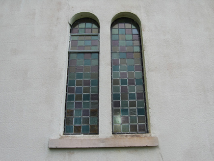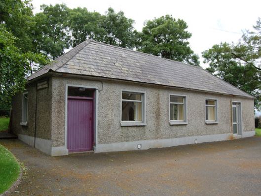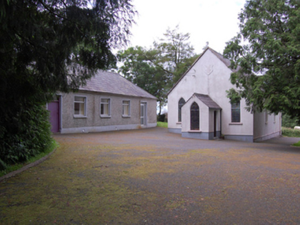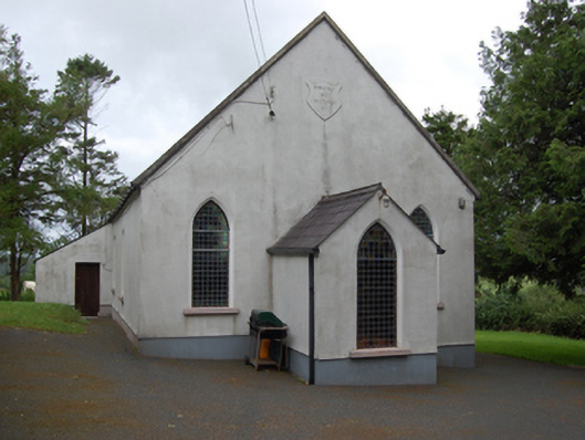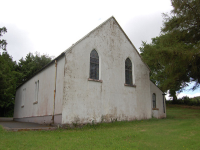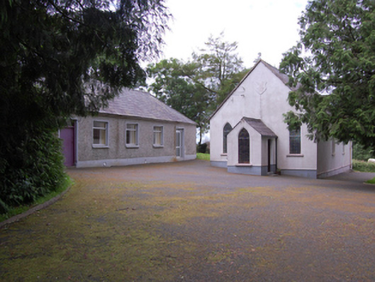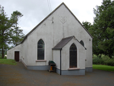 Freestanding single-cell Methodist church, built 1803, having three-bay nave with gable-fronted single-bay porch to the east gable end, and single-bay lean-to vestry to south elevation of nave. Pitched roof with raised cut limestone barges and sections of cast-iron rainwater goods. Smooth ruled-and-lined rendered walls over rubble stone construction with recessed rendered plinth. Raised shield plaque near apex of front gable with inscription 'ERECTED 1803 / RESTORED 1903'. Pointed arch window openings to gables and entrance porch with chamfered reveals and painted sills. Paired round-headed windows to nave with shared sills. Round-headed window to vestry. Multiple-pane stained-glass windows. Square-headed door openings to porch and vestry, both with replacement sheeted timber door. Interior having carved timber altar table, pulpit, and baptismal font. Set in own grounds approached by straight drive bordered by rubble stone walls with square-profile rubble stone piers and wrought-iron gates. Detached five-bay single-storey hip-roofed school, built c.1870, to site.