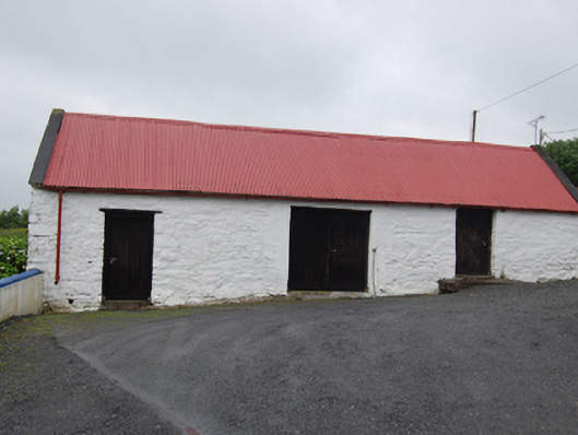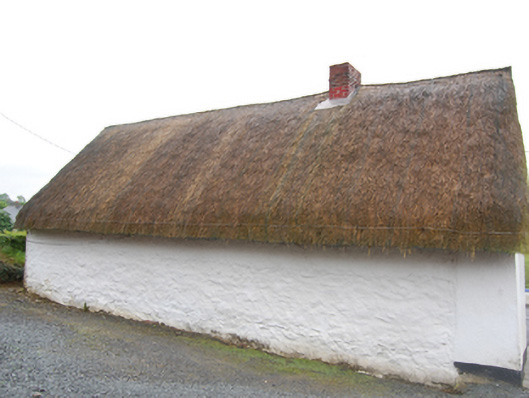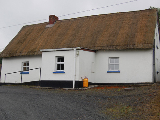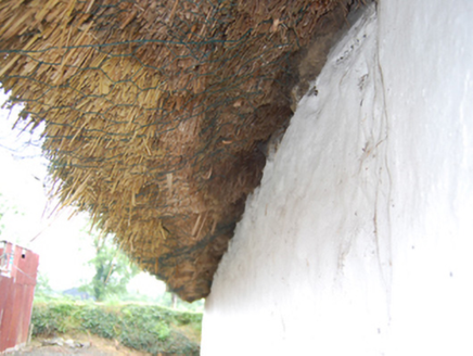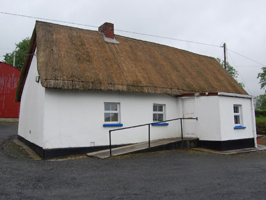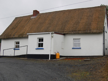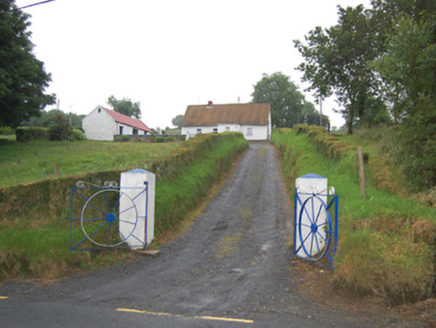 Detached four-bay single-storey with dormer attic lobby-entry thatched vernacular house, built c.1860, with unfenestrated rear elevation, and later flat-roofed porch to front. Pitched thatch roof of wheaten straw with plain bobbin ridge and gable ends, red brick chimneystack. Slight batter to gables indicating mud wall construction. Replacement smooth render with raised plinth to front elevation. Lime-washed random rubble walls to rear elevation. Square-headed window openings with painted sills and uPVC replacement windows. Square-headed door opening to side of entrance porch having uPVC replacement door approached by concrete ramp. Opens directly to famyard with rubble stone outbuilding set at right angle to front having corrugated-iron roof. Set back from road with square-profile rendered piers and double-leaf gates with wheel motif.