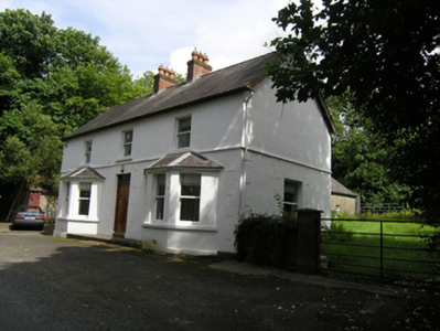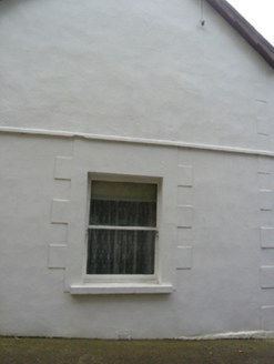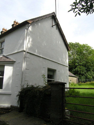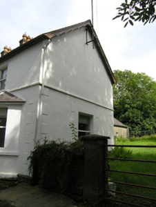 Detached three-bay two-storey house, built 1913, bay windows flanking entrance to front, single-storey return to rear. Pitched slate roof with clay ridge tiles, oversailing eaves with decorative saw-tooth to oversailing barges, central pair of brick chimneystacks with cornice and octagonal chimney pots with stepped collars to top, brick chimneystack to return, cast-iron rainwater goods. Ruled-and-lined rendered walls over plinth course, raised render quoins to front elevation, string course below first floor windows, smooth rendered walls to rear elevation. Square-headed door and window openings. Canted bay windows with continuous sill and cornice below hipped slate roofs. Stucco block-and-start surrounds to windows in ground floor of gables. One-over-one timber sash windows to ground and first floors. Render Gibbsian surround to entrance, with six-panelled raised-and-fielded panelled door and glazed overlight. Single-storey outbuilding to north at roadside with pitched slate roof and central chimneystack, ruled-and-lined rendered walls with plinth course.