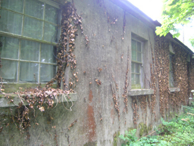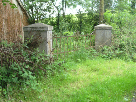 Detached four-bay single-storey house, built c.1920, now disused. Pitched slate roof with clay ridge tiles and oversailing eaves having timber soffit and decorative bargeboards having pointed arch and punched detail terminating in roundel motifs. Rendered chimneystack to gable, and cast-iron rainwater goods. Ruled-and-lined rendered walls. Six-over-six pane timber sliding sash windows with stone sills and plain reveals. Timber battened door with glazed overlight. Square-profile rendered piers with pyramidal cappings, set diagonally, flanking iron gates.