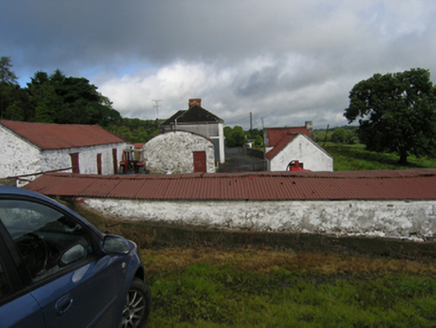 Detached three-bay two-storey farmhouse, built c.1920, with two-storey return, single-storey entrance porch. Hipped slate roof, clay ridge tiles, tall red brickstacks with yellow brick decorative band. Replacement uPVC rainwater goods. Ruled-and-lined rendered walls to ground floor below a stucco platband under first floor sills, rusticated stucco quoins, and pebbledash to first floor. Roughcast rendered walls to rear elevation and return. Flat roofed porch having ruled-and-lined rendered walls and gadroon-profiled concrete pediment as blocking course. One-over-one timber sliding sash windows with wide margin panes, raised stucco architrave, and stone sills. Replacement door and side lights. Vernacular building attached to east gable serving as side entrance porch having a curved corrugated iron roof and cast-iron rainwater goods. Early vernacular farmhouse complex, c.1820, retained within farmyard to the south-east. Pitched corrugated-iron roofs and timber battened doors.