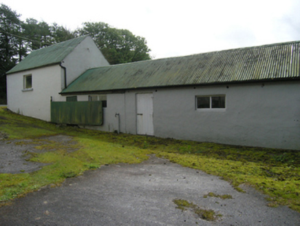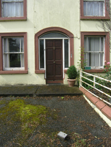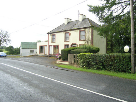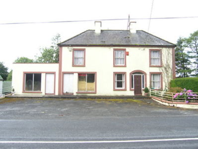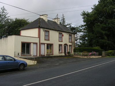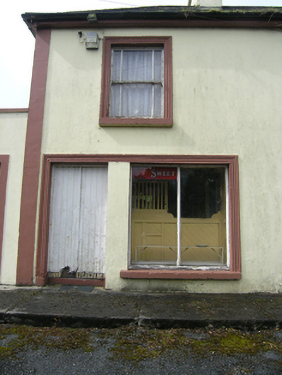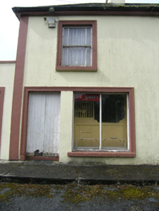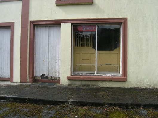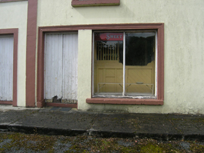 Detached three-bay two-storey over basement house, built c.1930, with entrance between eastern bays and integral shop to western bay, set on sloping site exposing full basement level to rear with recent return. Flat roofed single-storey over basement side extension to the west, c.1970. Hipped slate roof with clay ridge tiles, eaves course, and cast-iron rainwater goods. Substantial smooth rendered chimneystacks with capstones indicating a tripartite internal plan and hearth-lobby entrance to domestic section. Smooth rendered walls, stucco pilasters to corners. One-over-one pane timber sliding sash windows with wide margin panes, stone sills, and raised stucco surrounds. Segmental-headed entrance with stucco surround, replacement door with shallow fanlight, and sidelights over low sills. Shopfront having raised stucco architrave enclosing door and large fixed double pane window divided vertically over a low sill. Double-leaf timber battened door to shop. Historic shop interior with back screen to display window with diagonal sheeting. Timber battened doors to basement level to rear. External concrete stair up to ground level of return. Range of outbuildings to side with rendered walls and pitched corrugated-iron roofs. House and shop open directly to footpath, set back from road, with small garden at east bay enclosed by horizontal railing on plinth wall.