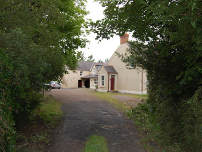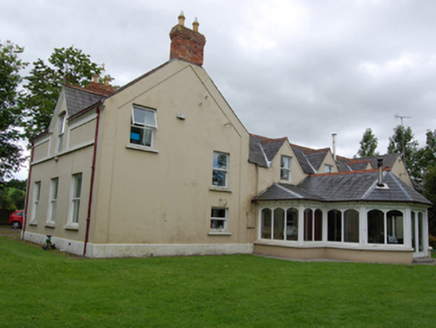 Detached L-plan three-bay two-storey former manse, built c.1890, having central gabled dormer window, gabled entrance porch to south gable, three-bay wing to rear with dormer windows having carriage arch in western bay and connecting to two-storey outbuilding. Recent lean-to extension to south of rear wing incorporating roof canopy over carriage arch and conservatory to north. Now in use a private dwelling. Pitched slate roof with terracotta ridge tiles having low eaves forming central gablet to dormer window, spiked finials to gable apexes. Stucco eaves cornice and verge moulding to dormer gable. Red brick chimneystacks to gables having stepped cornice detail and clay pots. Cast-iron rainwater goods having decorative square profile with decorative lugs to front elevation and porch. Smooth rendered walls with raised plinth, plat band at dormer sill level and below eaves cornice. Raised render band to corners and end gable verges. One-over-one timber sash windows having dressed stone sills. Raised render window surround to side of entrance porch. Square-headed door opening having sheeted timber door, coloured glass to decorative overlight, and flanked by bell with spiked finial. Site entrance shared with adjoining former Presbyterian church having two sets of wrought-iron gates with rendered convex quadrant screen wall and square-plan piers. Two-storey three-bay outbuilding attached to rear wing with slate roof, external stairs to gable, smooth rendered walls, and central segmental-arched opening with keystone inscribed with date 'AD 96' flanked by door openings.