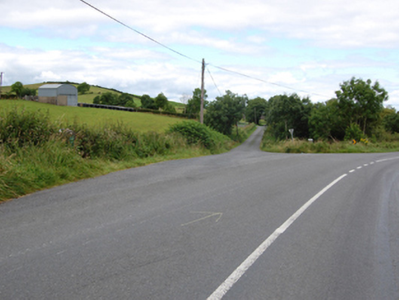 Wall-mounted cast-iron post box, erected c.1940, with raised 'P&T' cipher in Gaelic script above letter slot. Maker's name at base in raised lettering, overpainted with only 'Enniscorthy' legible. Set in a freestanding rendered pier with stepped cap at a rural road junction.