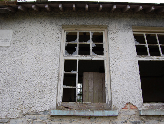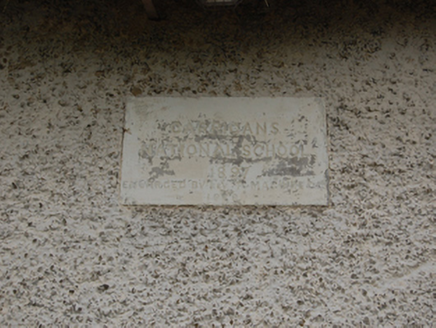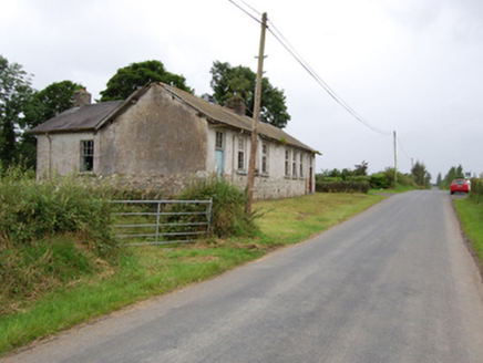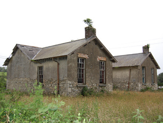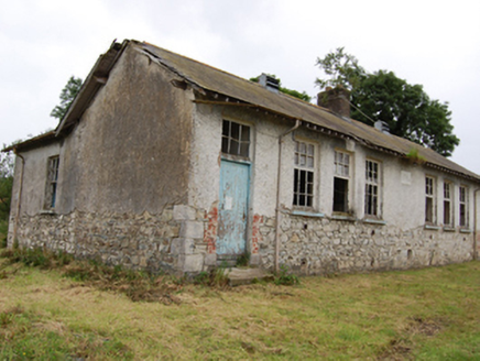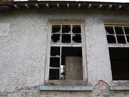 Detached U-plan eight-bay single-storey school, built 1897, having entrances to outer bays, extended 1929 with two-bay symmetrical wings to rear. Now disused. Pitched oversailing slate roof with carved and plain rafter ends, red brick chimneystack to centre of original block and to extension gables, sections of cast-iron rainwater goods. Roughcast rendered walls over rubble stone construction with dressed quoins. Stone plaque to centre of front elevation inscribed 'CARRIGANS NATIONAL SCHOOL / 1897 / ENLARGED BY REV T. MAGUIRE CC / 1929'. Tall windows in two pairs of three having dressed stone sills with multiple pane six-over-nine timber windows with tilting upper casements to original building. Paired six-over-nine timber sash windows to gables of extensions and single six-over-six to sides. Sheeted timber doors having six-pane overlight opening to single limestone step, set back from the road. Surviving sections of rubble stone wall to rear yard.