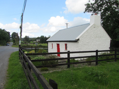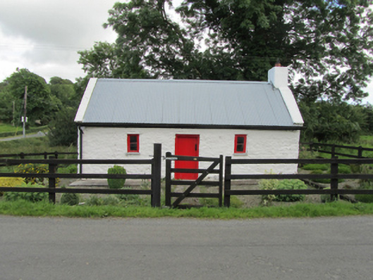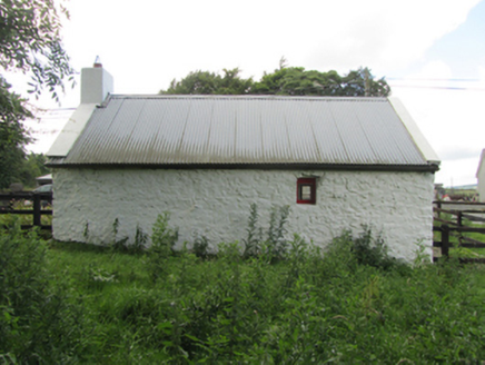 Detached three-bay single-storey direct-entry vernacular house, built c.1850. Pitched roof with recent corrugated metal and rendered barge coping, rendered chimneystack to south gable, uPVC rainwater goods. Rubble stone walls, concrete sills to window openings. Timber casement windows flanking timber sheeted entrance door. Recent timber boundary fence.