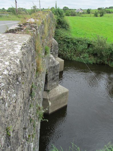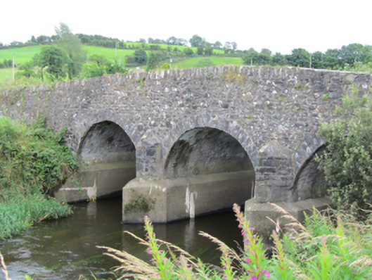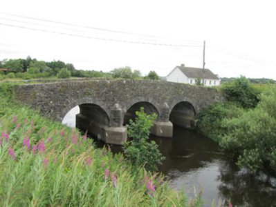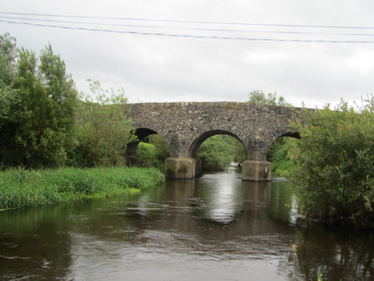 Triple-arch stone bridge, built c.1800, over river flowing south to Lough Ramor. Round arches of equal size having rendered rubble stone soffit with dressed arch ring of unequal voussoirs. Rubble-stone cutwaters with splayed tops to both faces. Random rubble spandrels, parapets and wing walls. Wing walls retaining approach roads reinforced with recent steel ties and plates to faces. Scotch copings to parapets. Recent concrete addition to abutments and cutwaters with splayed cap.