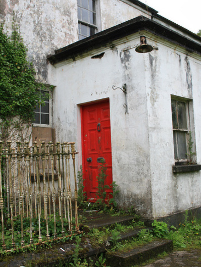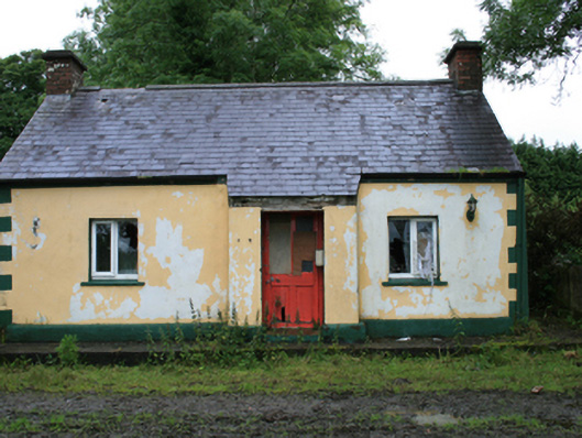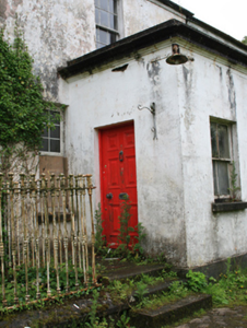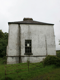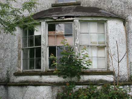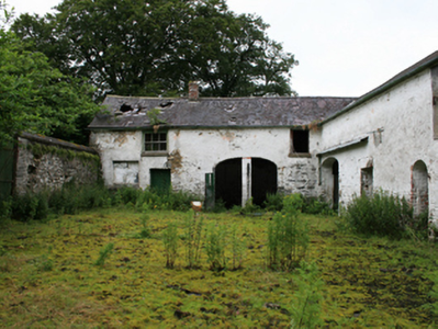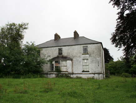 Detached three-bay two-storey over basement glebe house, built c.1810, having slight breakfront to front elevation with single-storey porch of c.1890 between original side lights, and central bow window to ground-floor at rear. Now disused. Hipped slate roof to front with replacement slate to rear, clay tiles to ridge with pair of red brick symmetrically arranged chimneystacks and cast-iron rainwater goods. Curved slate roof to rear bow. Roughcast rendered walls with smooth-rendered ruled-and-lined render finish to breakfront and porch, dressed stone eaves and plinth courses. Six-over-six timber sash windows to first floor, wider openings to outer bays at ground floor, northern bay having historic timber Wyatt window of six-over-six sliding-sash and fixed side-lights, southern bay altered as door from bridge over basement area alongside two-over-two sash window. uPVC windows to sidelights, two-over-two timber sash window to front of porch with replacement timber entrance door to side. Six-over-six timber sash windows to rear diminishing in height from ground to first floor. Central bow window rising from basement with three bowed six-over-six timber sash windows. Porch opens to steps with cast-iron railings around basement area to front of house with square-profile rendered piers resting on stone plinth. Three ranges of two-storey outbuildings enclosing courtyard to north-east with pitched slate roofs and brick chimneystacks, rubble stone walls with round-headed openings to ground floor and remains of three-over-three timber sash windows and timber sheeted doors. Three-bay single-storey gate lodge with pitched slate roof, brick gable chimneys, projecting entrance bay, and smooth rendered finish.