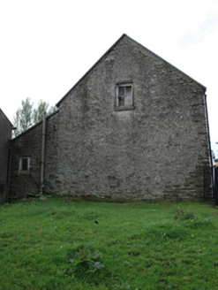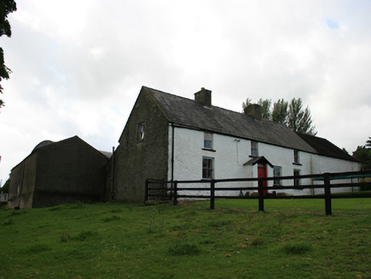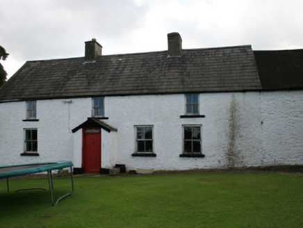 Attached four-bay two-storey vernacular farm house of hearth-lobby plan form, built c.1840, with gabled porch. Three-bay single-storey lean-to extension to rear added c.1920. Pitched slate roof with clay ridge tiles, pair of rendered chimneystacks flanking centre bays, concrete barge coping to south gable, and cast-iron rainwater goods. Random rubble stone walls, lime washed to front elevation only. Two-over-two timber sash windows to ground and first floor with stone sills. Timber sheeted door and overlight to porch with sandstone flagstone at door. Attached double-height outbuilding to north. Recent farm buildings to west side of rear yard.