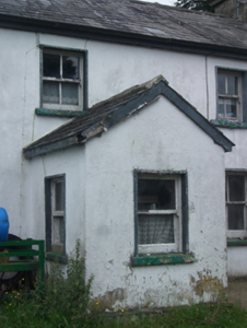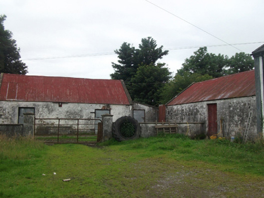 Detached three-bay two-storey former house, built c.1810, with off-centre gable-fronted porch. Now in agricultural use. Pitched slate roof with clay ridge tiles and concrete barge coping, rafter ends exposed to rear. Smooth-rendered chimneystacks to gables, with steel and uPVC rainwater goods. Smooth-rendered walls to front elevation with raised bands to corners, ruled-and-lined to porch on stone plinth, roughcast rendered walls elsewhere. Window openings having patent reveals and stone sills, with two-over-two and one-over-one timber sliding sash windows having convex horns and original glass. Square-headed timber battened door to side of porch. L-plan outbuildings with pitched corrugated-iron roofs to north enclosed by rendered boundary wall with moulded concrete coping and capstone to piers. Approached by laneway with remnant of rubble boundary wall and piers with decorative render detailing.