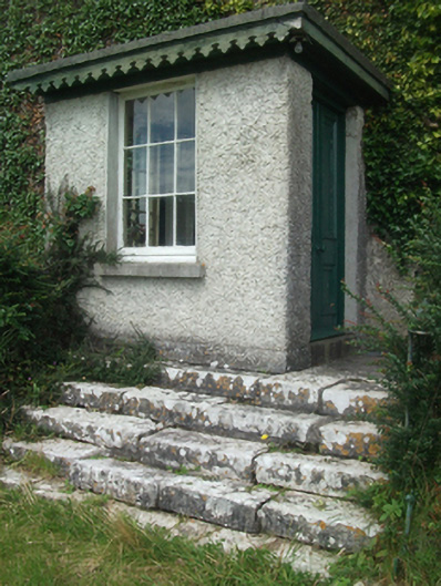 Detached three-bay two-storey over basement house, built c.1800, with two-storey return to rear, and later single-storey porch to entrance front. Hipped slate roof with clay ridge tiles, pair of rendered chimneystacks flanking central bay, steel rainwater goods, flat roof to porch with carved timber bargeboards. Red brick eaves course over roughcast rendered random-rubble walls and red brick dressings. Window openings with tooled limestone sills and six-over-six timber sash windows having original glazing, some with convex horns. Fixed nine-pane windows to porch. Timber-panelled door with central bead. Original doorcase to inner porch, having tooled Doric pilasters flanking glazed timber double-leaf doors with semicircular petal fanlight. Timber matchboard door to rear. Porch approached by cut limestone steps with twentieth-century steel railings. Outbuildings to rear, having pitched slate roofs, roughcast rendered rubble stone, integral carriage arches, and semi-circular window openings with red brick surrounds. Yard enclosed by rubble stone walls with carriage arch.