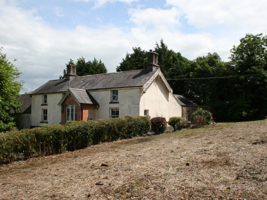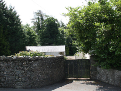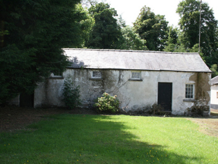 Detached four-bay two-storey former estate worker's house, built c.1880, with gabled porch, and single-storey rear return. Now disused. Pitched slate roof with clay ridge tiles, red brick chimneystacks comprising paired octagonal-profile shafts over south gable end and second bay from north. Overhanging eaves with ornamental latticework bargeboards to gable end and porch, terminating timber finial to porch. Cast-iron rainwater goods. Smooth rendered walls. Red brick walls to porch. Square-headed two-over-two timber sash windows to ground and first floor, one-over-one timber sliding sash window to side elevation, all with stone sills. Tripartite one-over-one sash windows to front elevation of porch, having timber sheeted door to side. Six-bay single-storey addition attached to north, having pitched slate roof, roughcast rendered walls to first section with exposed rubble stone walls to northern section. Blocked windows, carriage arch and recent door. Earlier six-bay two-storey outbuilding, c.1820, having pitched slate roof, smooth render to rubble stone walls, six-pane timber casement windows to upper level of north elevation, six-over-six timber sash window to ground floor, stone sills, timber sheeted doors with stone thresholds. Dog-yard to rear enclosed by high wrought-iron railings on plinth walls. Yard entrance comprising random rubble stone wall to east with Scotch coping curving into square-profile pier and ramped western wall rising to square-profile rubble stone pier, with pedestrian gate to west.