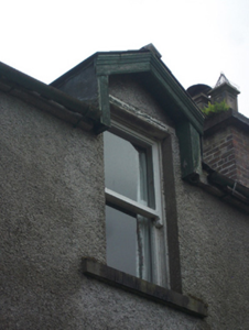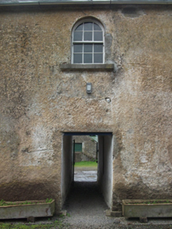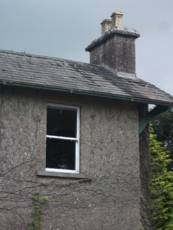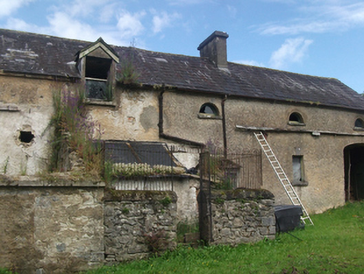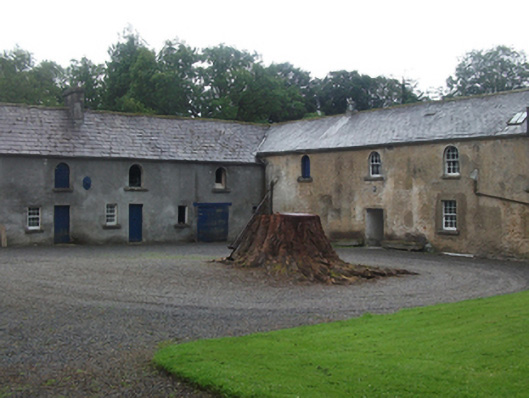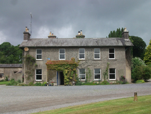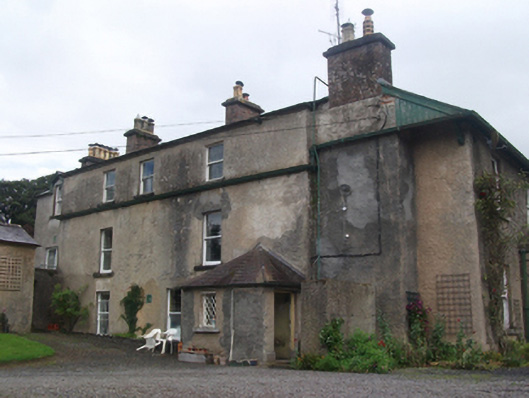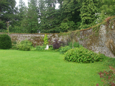 Detached L-plan five-bay two-storey over basement country house, built c.1760, with mid-nineteenth century front elevation having off centre single-storey porch, substantial multiple-bay wing facing stableyard, returns and glazed conservatory to rear. Pitched slate roof to front block with oversailing eaves on timber brackets, wide oversailing verges extending over large gable chimneystacks with truss-motif bargeboard to east, smaller stacks over roof level. Limestone parapet to flat-roofed porch with eaves cornice. Hipped slate roof to wing and to single-storey west porch. Clay ridge tiles and cast-iron rainwater goods throughout. Brick chimneystacks with projecting capstones to gables and rear eaves of front block and to ridge of wing, many having square-profile clay pots, some with panelled motif. Cast-iron water tank to projection on rear wing. Roughcast rendered walls. One-over-one timber sash windows to front with convex horns, in asymmetrical arrangement to accommodate stair hall. Lucarne windows to rear with timber barge boards. Varying casement and timber sash windows of various sizes to rear. Limestone sills throughout. Timber panelled and glazed door to porch, inner double-leaf panelled doors with aproned sidelights flanked by pilasters with carved corbel brackets and cornice. Gothic Revival conservatory on concrete piers with pointed arch mullions. Interior having bolection mouldings, limestone flags, and heavily moulded cast-iron staircase. U-plan farmyard to west. Former walled garden to rear with rounded rubble stone walls, segmental arches having irregular voussoirs and red brick surrounds. Rubble stone boundary walls.