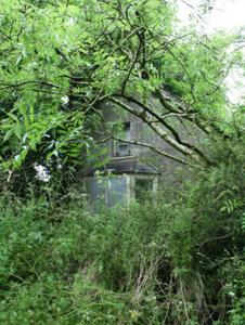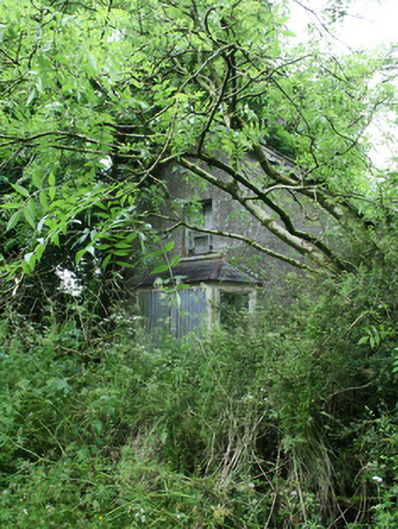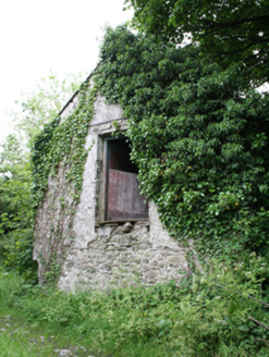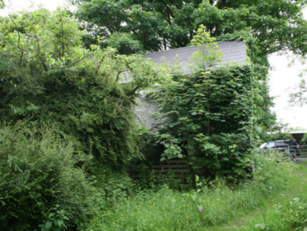 Detached five-bay two-storey vernacular house, built c.1800, with loft in full-height addition of c.1870 to north, set facing into farm courtyard with rear to road. Now disused and substantially overgrown. Pitched slate roof with clay ridge tiles and cast-iron rainwater goods, redbrick chimneystack to ridge over former south gable end, decorative bargeboard to south gable. Roughcast rendered walls. Front elevation overgrown and not seen. Three irregularly placed window openings to rear elevation with one-over-one timber sash windows and stone sills. Margin-paned timber sash window to first floor of south gable over canted timber bay window with slate roof having bipartite window and one-over-one sashes to sides. Rubble stone outbuilding under same roof to north with entrance at ground floor and loft level to the gable.