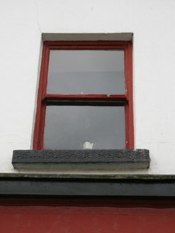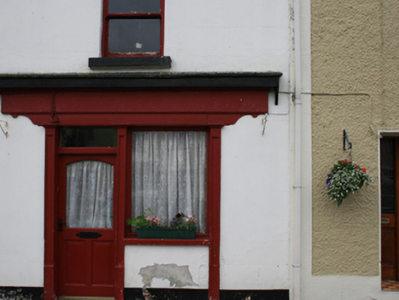 Terraced two-bay two-storey house, built c.1800, with disused shopfront to western bay at ground floor. Pitched slate roof with clay ridge tiles, shared rendered chimneystacks to party walls, cast-iron rainwater goods. Smooth-rendered ruled-and-lined walls with rendered plinth. One-over-one timber sliding sash window to ground and first floor with stone sills, including punched-dressed sill to window over shopfront. Shopfront comprising narrow display window over rendered stall riser with recent timber glazed door and overlight interposed with panelled timber pilasters. Signage fascia wider than shopfront resting on narrow frieze terminating in flat scroll profile below side projections. Simple cornice configured as hood on simple brackets.