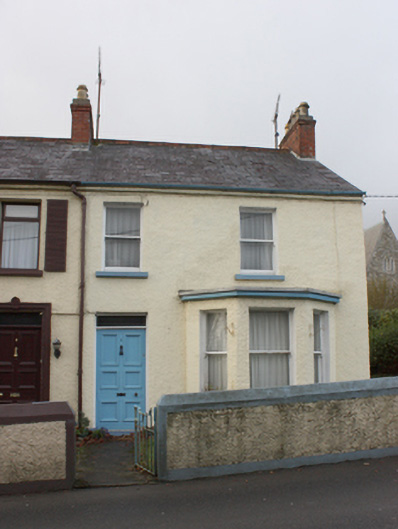 End-of-terrace two-bay two-storey house, built c. 1910, having single- bay flat-roofed canted bay window to the north-west end of the front elevation (north-east), and with two-storey extension to the rear (south-west) having single-bay single-storey outbuilding attached to the south-west with mono-pitched roof over. One of a terrace of four with its neighbours to the south-east (altered and not in survey). Pitched natural slate roof with red clay ridge tiles, modern flat roof to east canted bay window, modern lean-to metal-sheeted roof to south-west return, red brick chimneystacks to either end having cement rendered capping on stepped cornice, and with cylindrical moulded clay pots, projecting roughcast rendered eaves, half-rounded cast-iron gutters and round cast-iron downpipes. Roughcast rendered walls. Square-headed window openings having one-over-one pane timber sliding sash windows to front elevation and two-over-two pane timber sliding sash windows to rear and to return, smooth rendered reveals, and with painted sills. Square-headed entrance door opening to the south-east end of the front elevation having bolection moulded flat-panelled timber door with pain overlight, smooth rendered reveals, rendered plinth blocks, and rendered threshold; square headed doorway to return havening vertically-sheeted timber door with smooth rendered reveals. Set back from road to the north-west of the centre of Letterkenny with grass garden to north-east enclosed by roughcast rendered and rendered boundary wall with chamfered rendered coping over. Pedestrian gateway to the south-east end of the front elevation (north-east) with modern metal gate. Vehicular gateway to the north-west having a pair of smooth rendered ruled-and-lined gate piers (on square-plan) with metal gates. Tarmacadam driveway to north, concrete backyard to south-west enclosed by partly roughcast rendered rubble stone boundary wall with chamfered concrete coping over, single-storey lean-to shed to south-west having natural slate roof, rendered and roughcast rendered walls, and square-headed painted timber vertically-sheeted door.