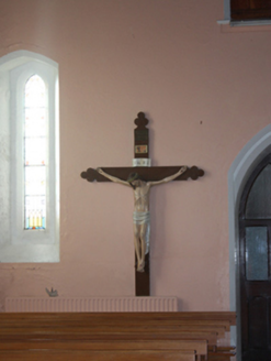 This attractive large-scale Catholic church retains its original form and character, despite some alterations to the interior. It is well-built using roughly squared and coursed rubble stone masonry with extensive cut stone trim throughout, particularly to the openings, the statue and statue niche, the clasping buttresses, and the raised verges to the gable ends. Of special note is the fine window opening to the chancel gable with intricate geometric Decorated Gothic tracery with quatrefoil and trefoil motifs; this window is of high artistic, and helps to elevate this building above many of its contemporaries in Donegal. The contrast between the dark rubble stone masonry and the crisp light-coloured sandstone detailing creates attractive textural and tonal variation to the exterior. The well-detailed statue of the Virgin Mary to the south elevation of the tower creates additional artistic interest. The pointed-arched openings lend this building a subdued Gothic Revival character that is typical of its type and date in Ireland. The scale of this church is indicative of the growing wealth and architectural ambition of the Catholic Church in Ireland at the time of erection. The stumpy but robust belltower to the south end is an unusual feature that is a landmark in the townscape of Ramelton. The form of this tower and the slightly awkward treatment of the openings at third stage level suggest that this feature was originally intended to be built higher or, perhaps, capped with a spire (this was never completed, perhaps for budgetary reasons). The spacious interior is notable for the complex open timber roof structure with scissor braces, the encaustic tiled floor, the marble altar goods, and the detailing to the chancel and transept arches. The stained glass windows, particularly those to the chancel gable, add further decorative interest to the interior. The interior was reordered c. 1970. Interestingly, this appears to have been the first Catholic church built at Ramelton (since the Plantation of c. 1610). Prior the construction of this church Catholics in the Ramelton area had to worship at a chapel at Kilcreen (or Killycrea\Killycrean) to the south-east (see 40804603), which was extant in 1834 (Ordnance Survey first edition six-inch map) and apparently went out of use in the 1930s. This church at Ramelton was apparently consecrated in 1890 although some sources suggest that it opened in 1892. Slater’s Directory of 1894 records that it was built at a cost of £1,800, with the Rev. Thomas Slevin the parish priest at this time (and the individual that was likely the first priest at this church). This fine church, located in a prominent site to the south-west of the centre of Ramelton, is a local landmark and an integral element of the architectural heritage and social history of the local area. Ramelton was formerly known as 'The Holy City' c. 1900 on account of the presence of so many churches (8 of which 6 survive) at the time. The boundary wall to the east with intricate cast-iron railings over, the other boundary walls to site, and the cut stone memorials (see 40823021) add to setting and context, and complete this appealing composition.